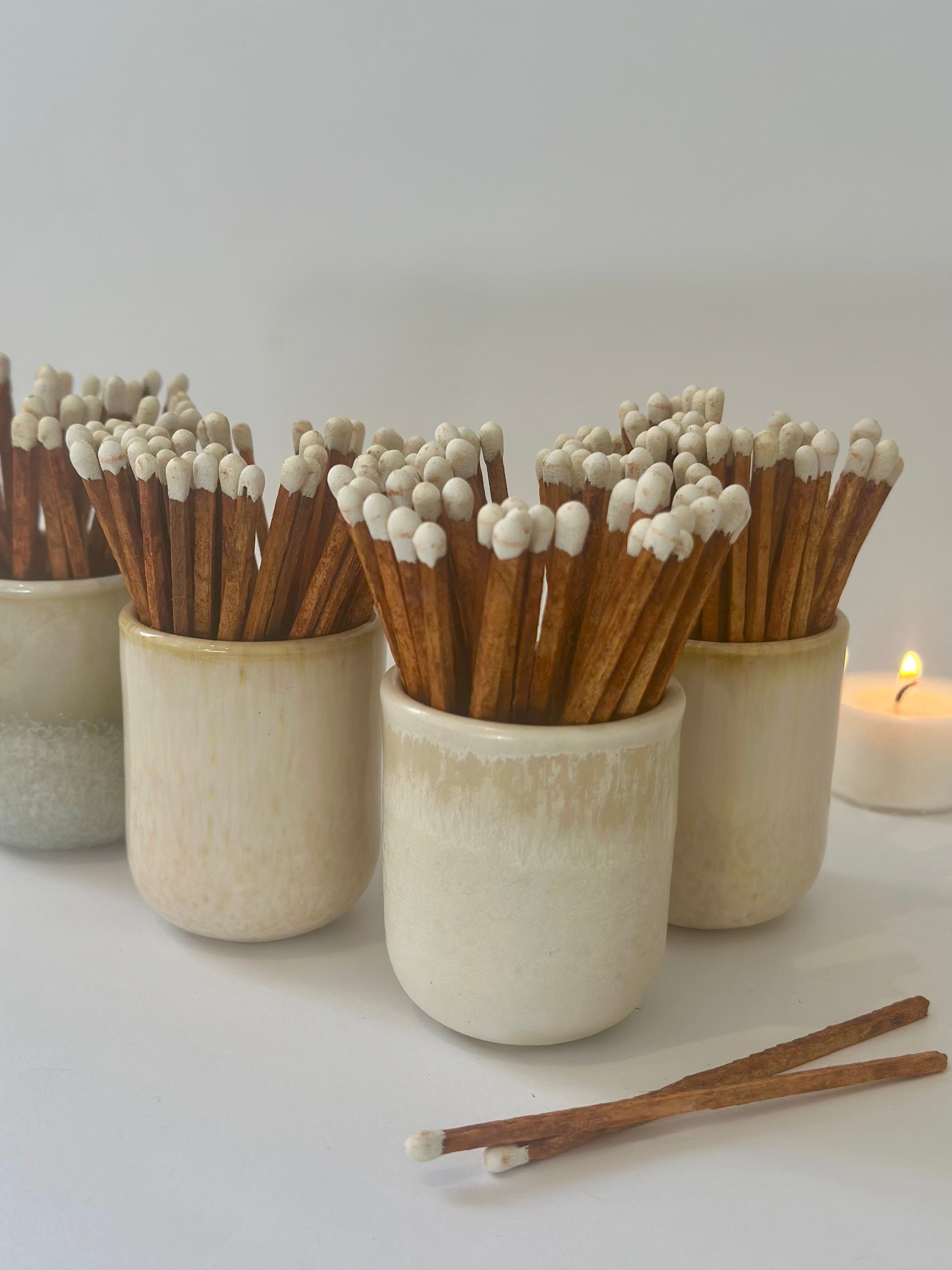 Glazed stoneware pot with a handcrafted feel. The pot has a reactive glaze that creates beautiful, variegated colourings, giving each one a unique appearance. Complete with 50 long cinnamon coloured wooden matches with white tips.